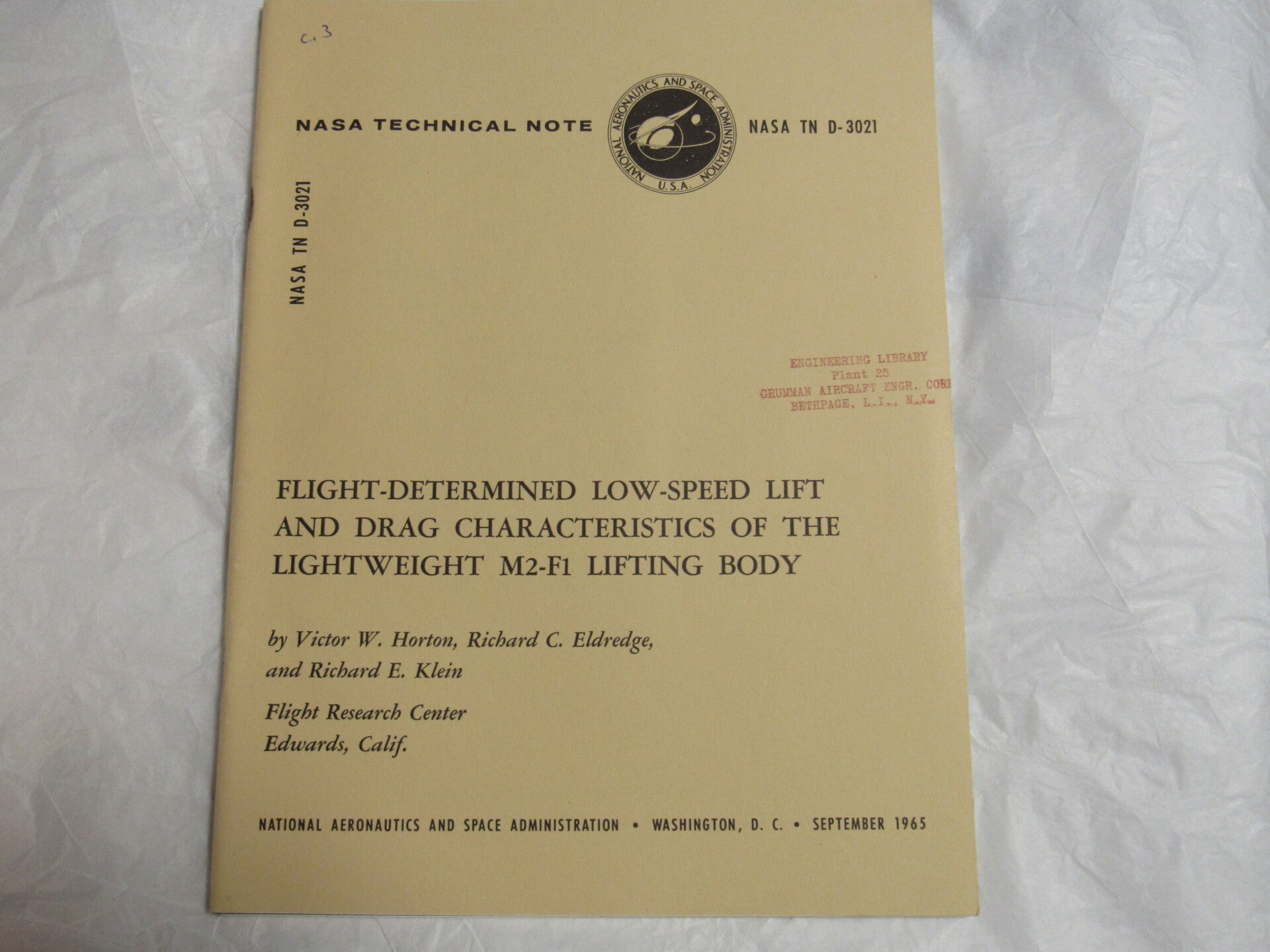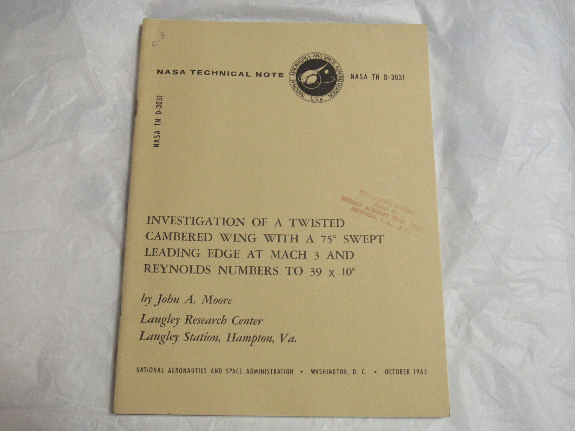 Five original technical notes from NASA on various flight and material subjects. From the Engineering Library of the Grumman Aircraft Engineering Corps and contains their stamp on front cover. Otherwise unmarked, clean, and well bound.