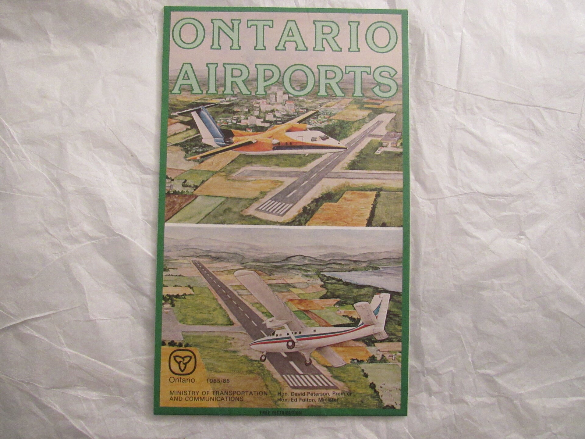 A large fold-out colour map of Ontario province, Canada with marked roads, cities, and airports with other information.