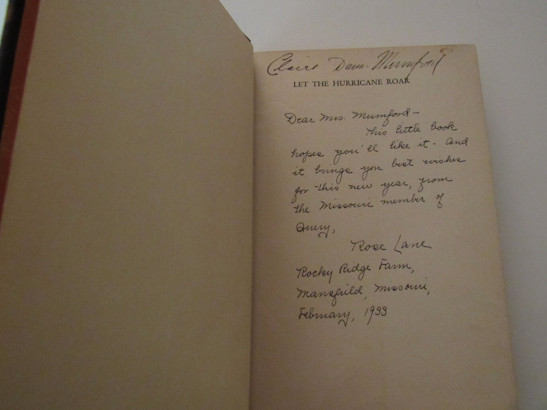 Inscribed to Claire Dana-Mumford with a long letter and signed by Rose Wilder Lane.
