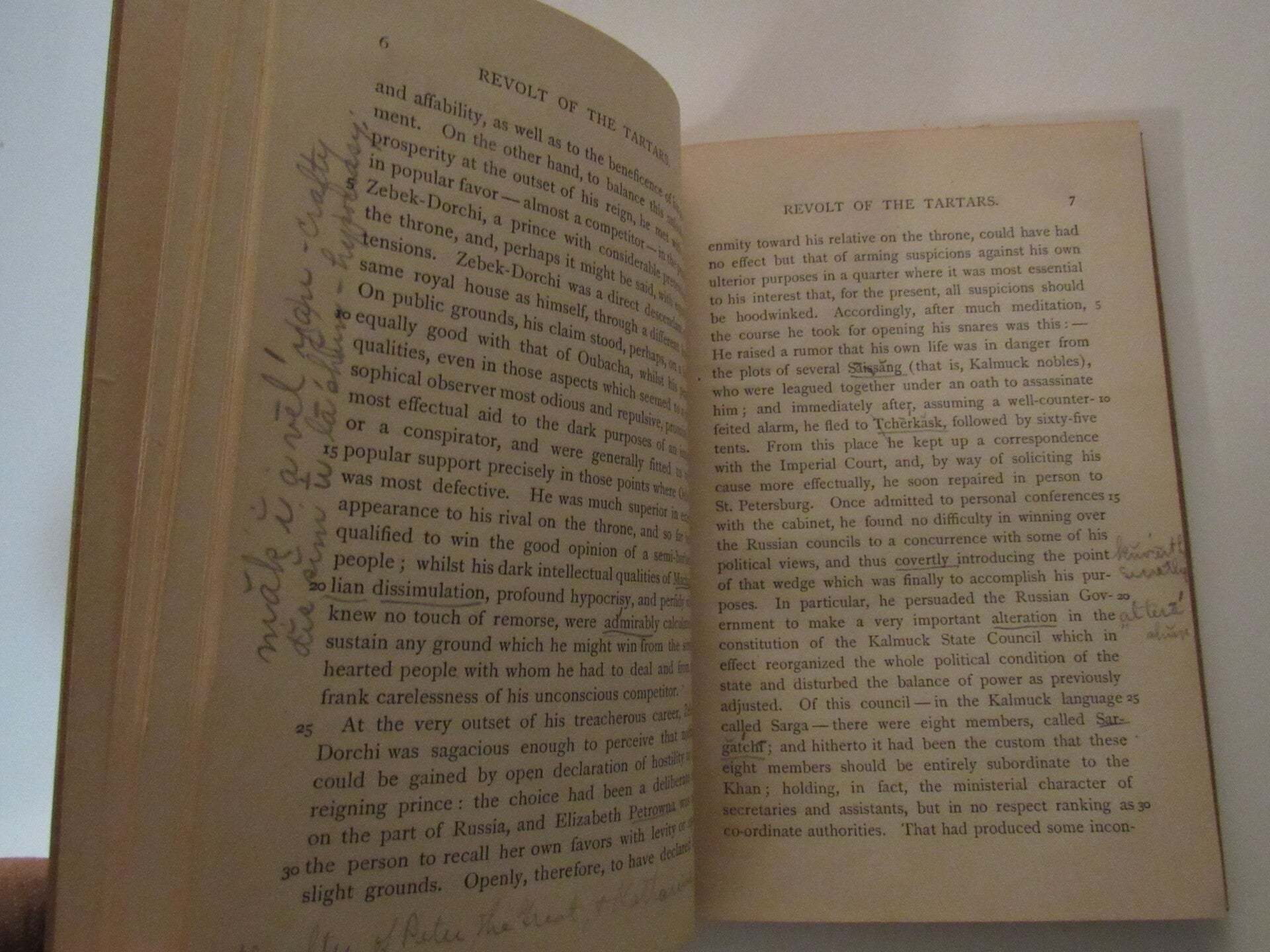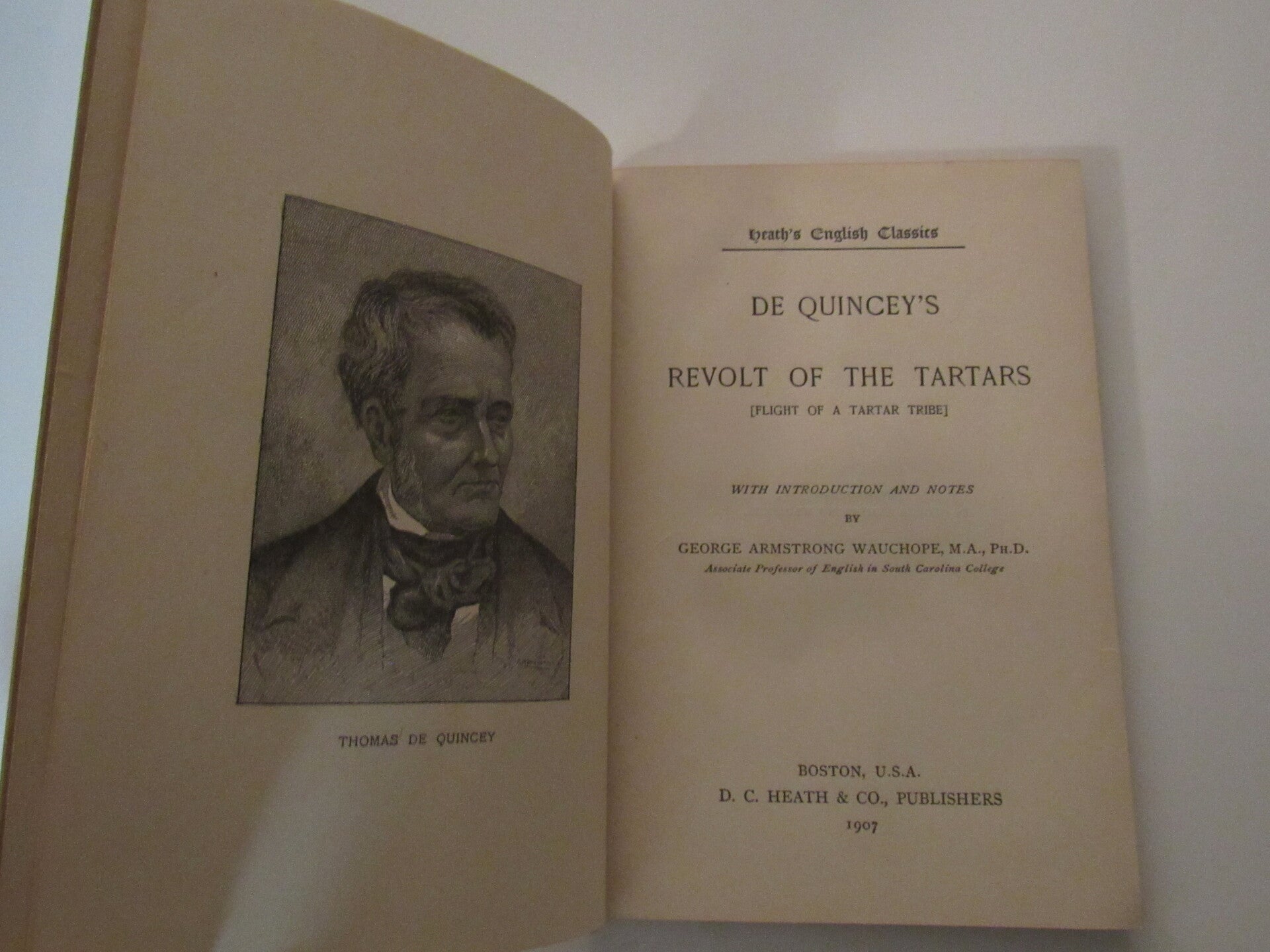 The Revolt of the Tartars is a good illustration of his power. Attracted by the chance reading of an obscure French missionary and traveller to the dramatic possibilities of an episode in Russian history, De Quincey built from the bare notes thus discovered, supplemented by others drawn from a matter-of-fact German archæologist, a narrative which for vividness of detail and truthfulness of local color belongs among the best of those classics in which fancy helps to illuminate fact, and where the imagination is invoked to recreate what one feels intuitively must have been real.