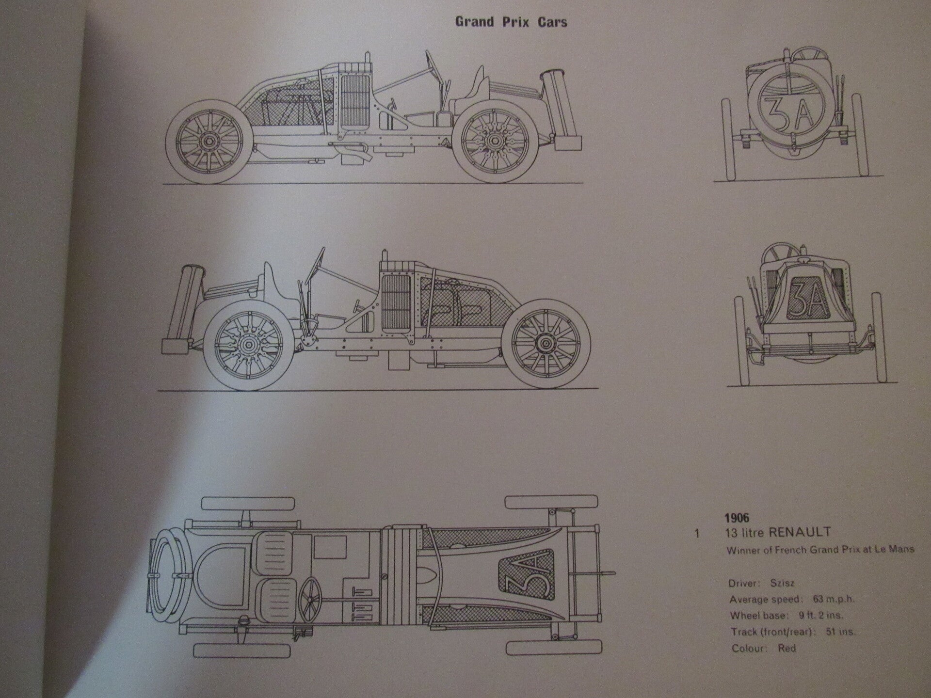Forty Grand Prix cars from 1906 through 1963, in top, sides, front and back scale drawings (5 drawings per car); thirty sports cars from 1896 through 1964 in top, side and front views (3 drawings per car).