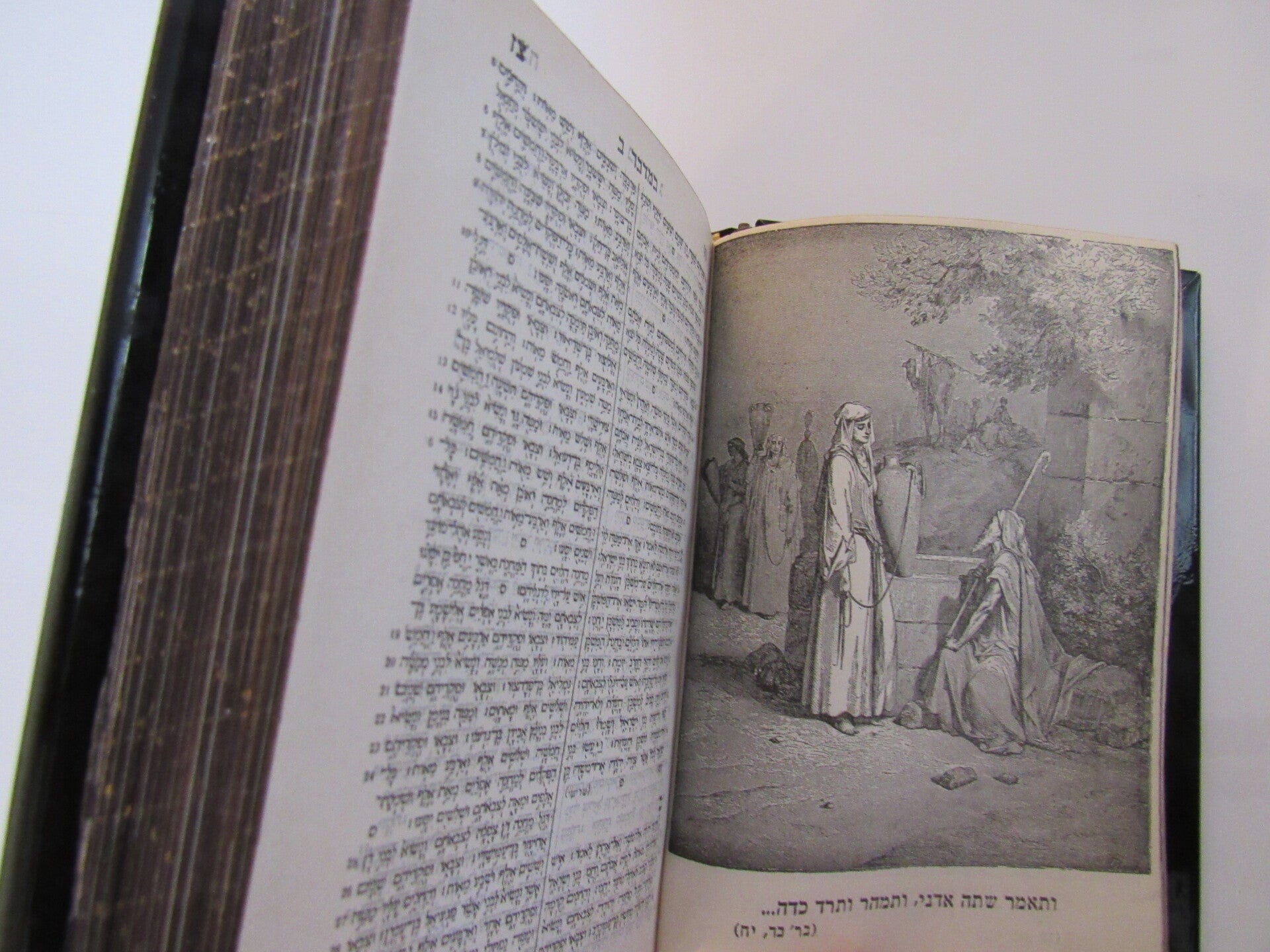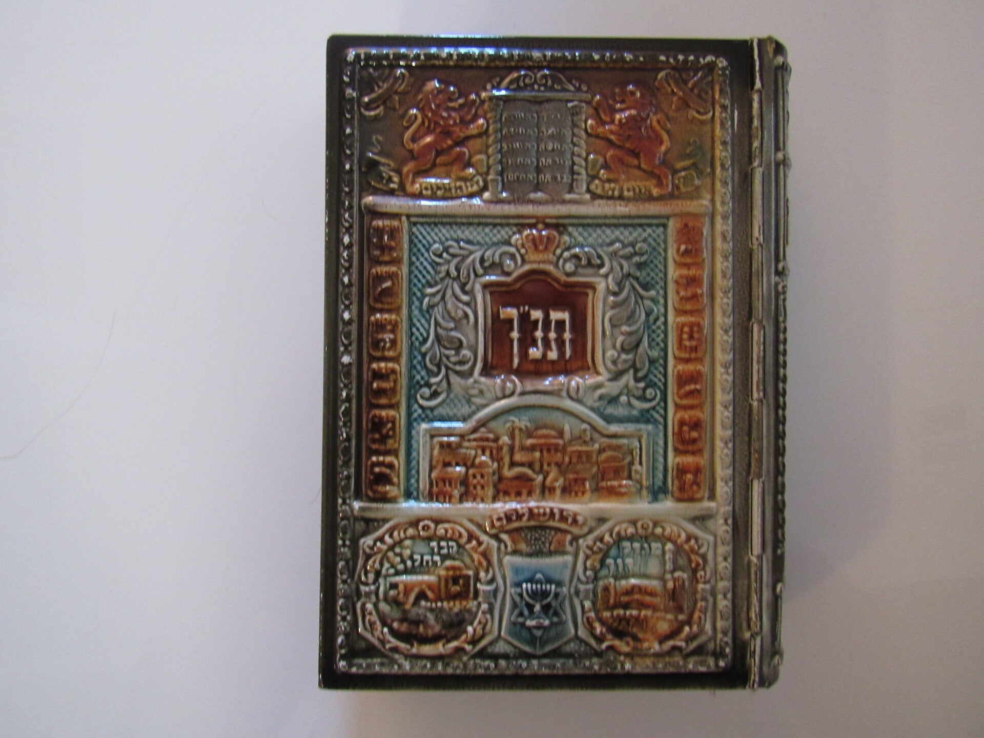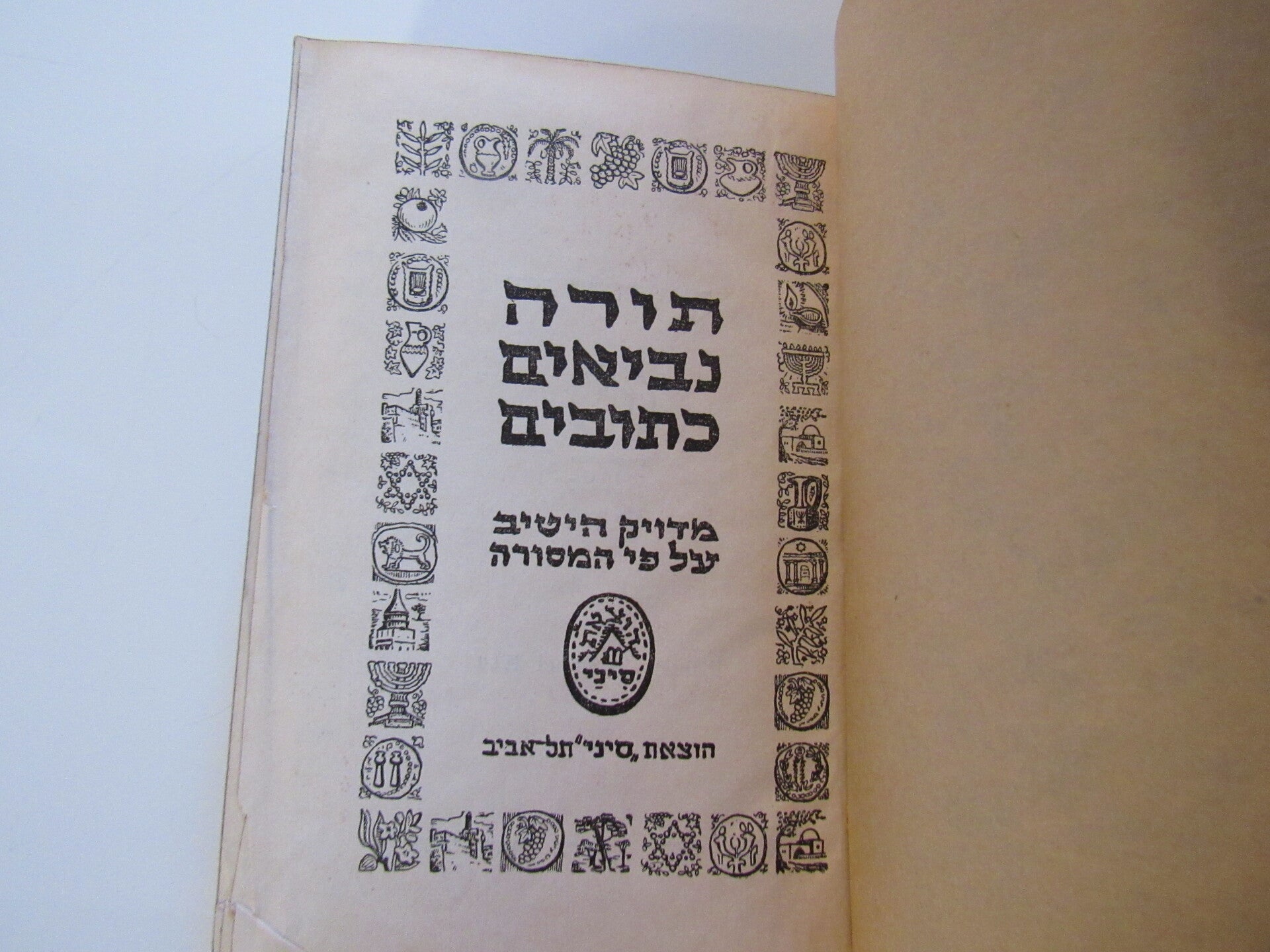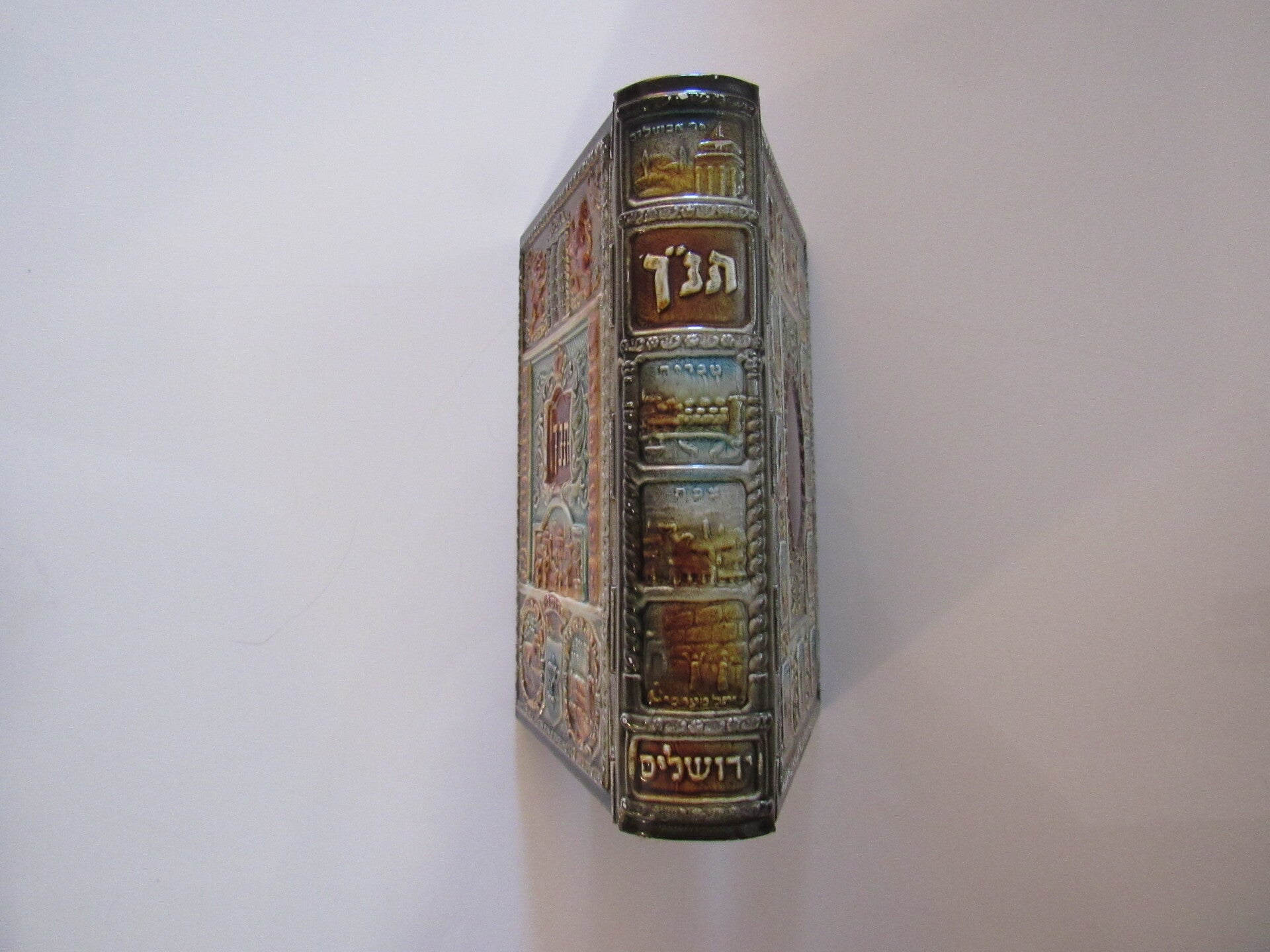This vintage Hebrew prayer book was published in Israel and features a beautifully detailed embossed metal cover with vibrant enamel accents. The text is in Hebrew with decorative elements surrounding the pages, and it includes illustrated plates depicting key biblical scenes. Published by Sinai Publishing in Tel Aviv, this piece is a significant religious and collectible artifact.