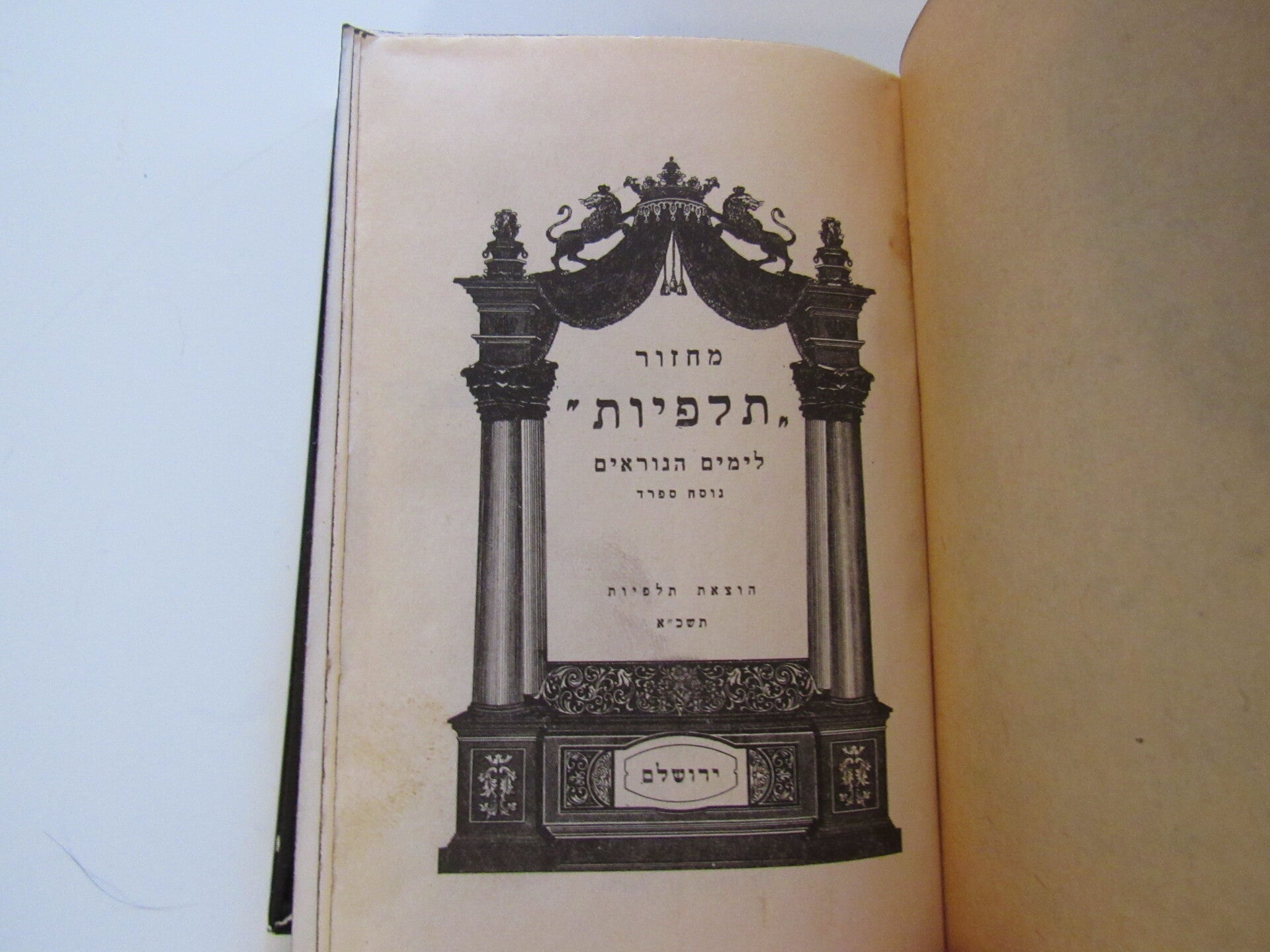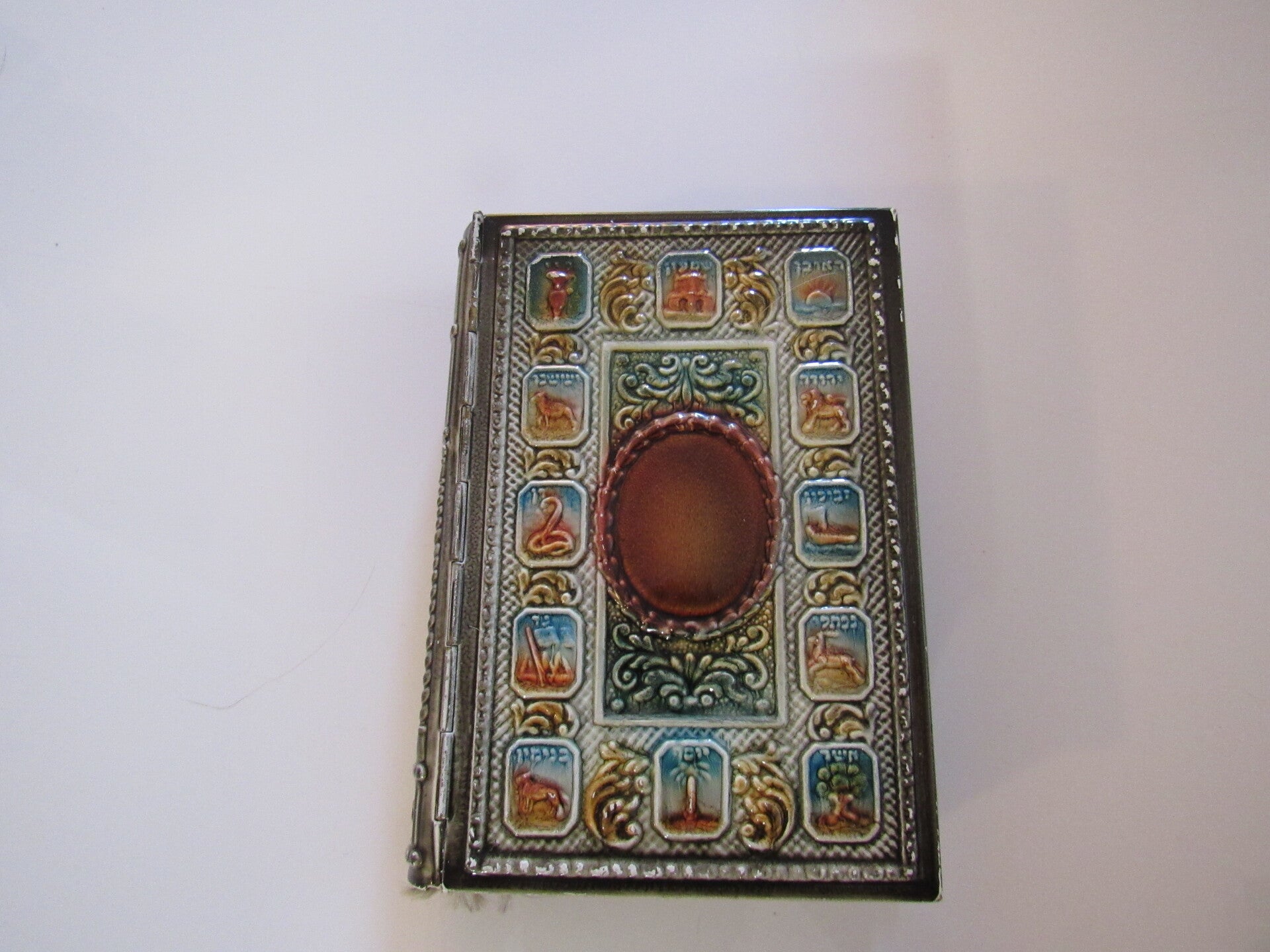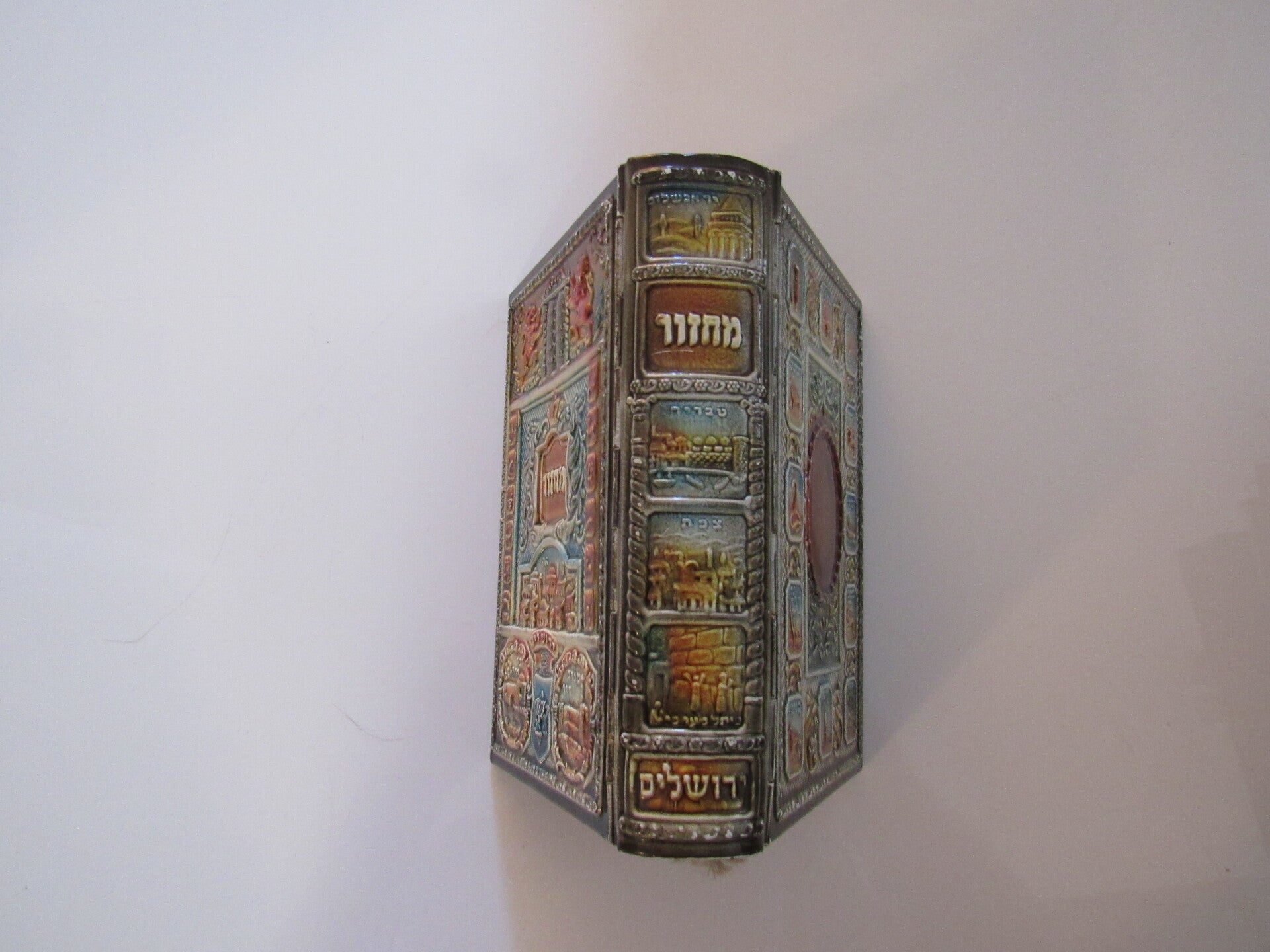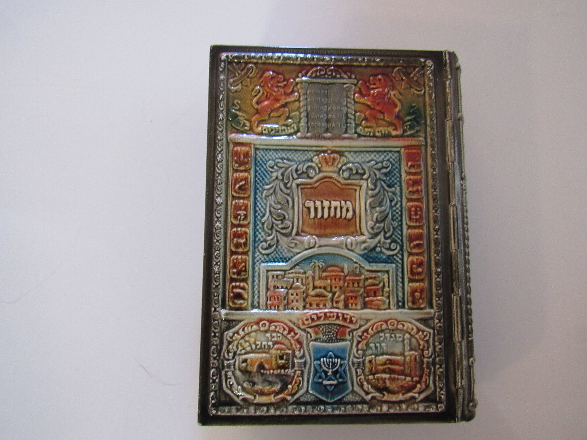 Beautifully bound Machzor Takafiyot prayer book for the High Holy Days, featuring a metal ornate embossed cover with vibrant enamel highlights. The front cover showcases intricate depictions of Jerusalem, the Ten Commandments, and the words "Machzor" in Hebrew, framed by decorative motifs and symbols representing the Twelve Tribes of Israel. The spine continues the detailed design, adding to its visual appeal. This prayer book is printed entirely in Hebrew and follows the Sephardic Nusach. Published in Israel, as indicated by the imprint on the title page. An exquisite collectible piece of Judaica, ideal for display or religious use.
