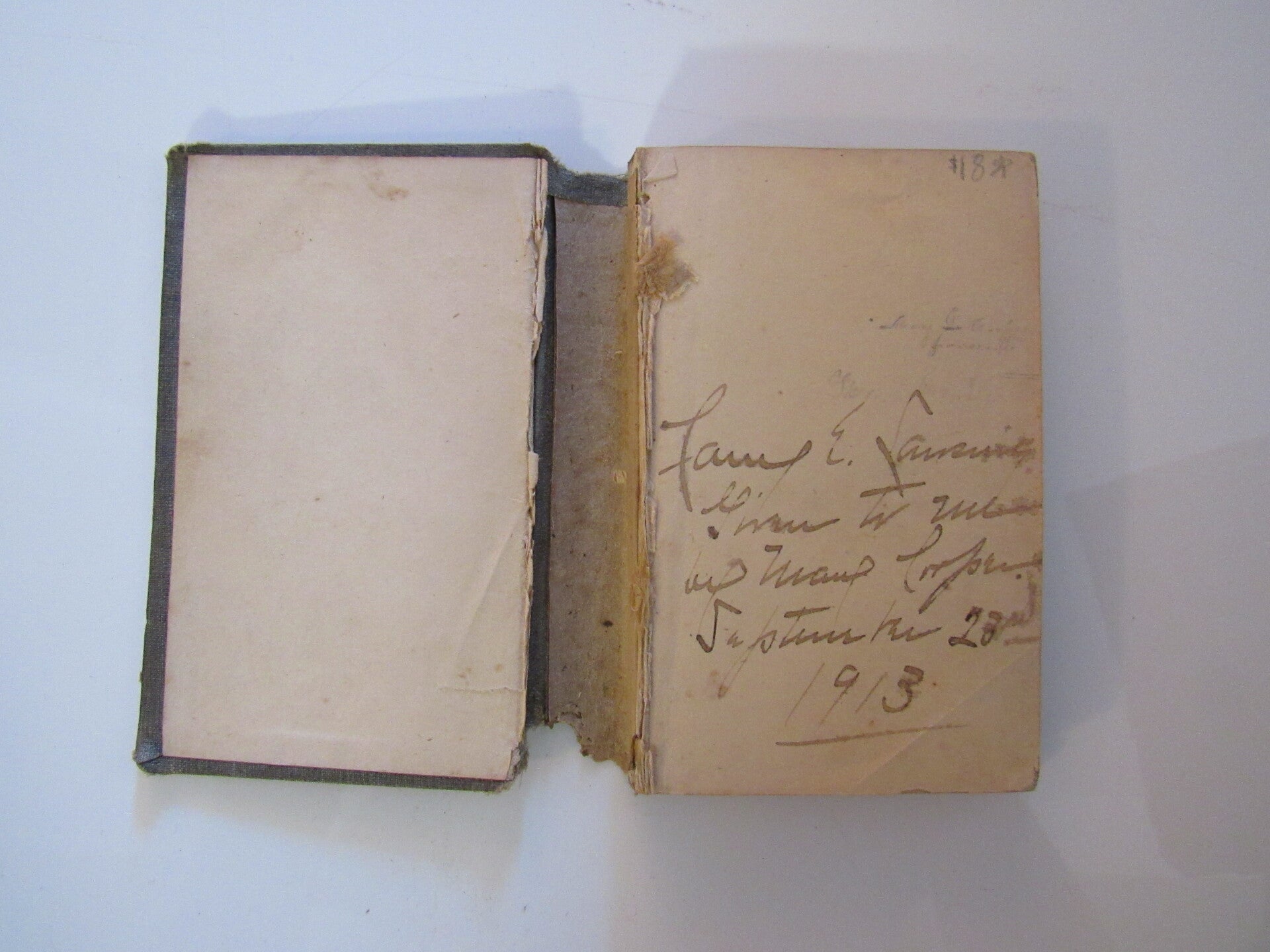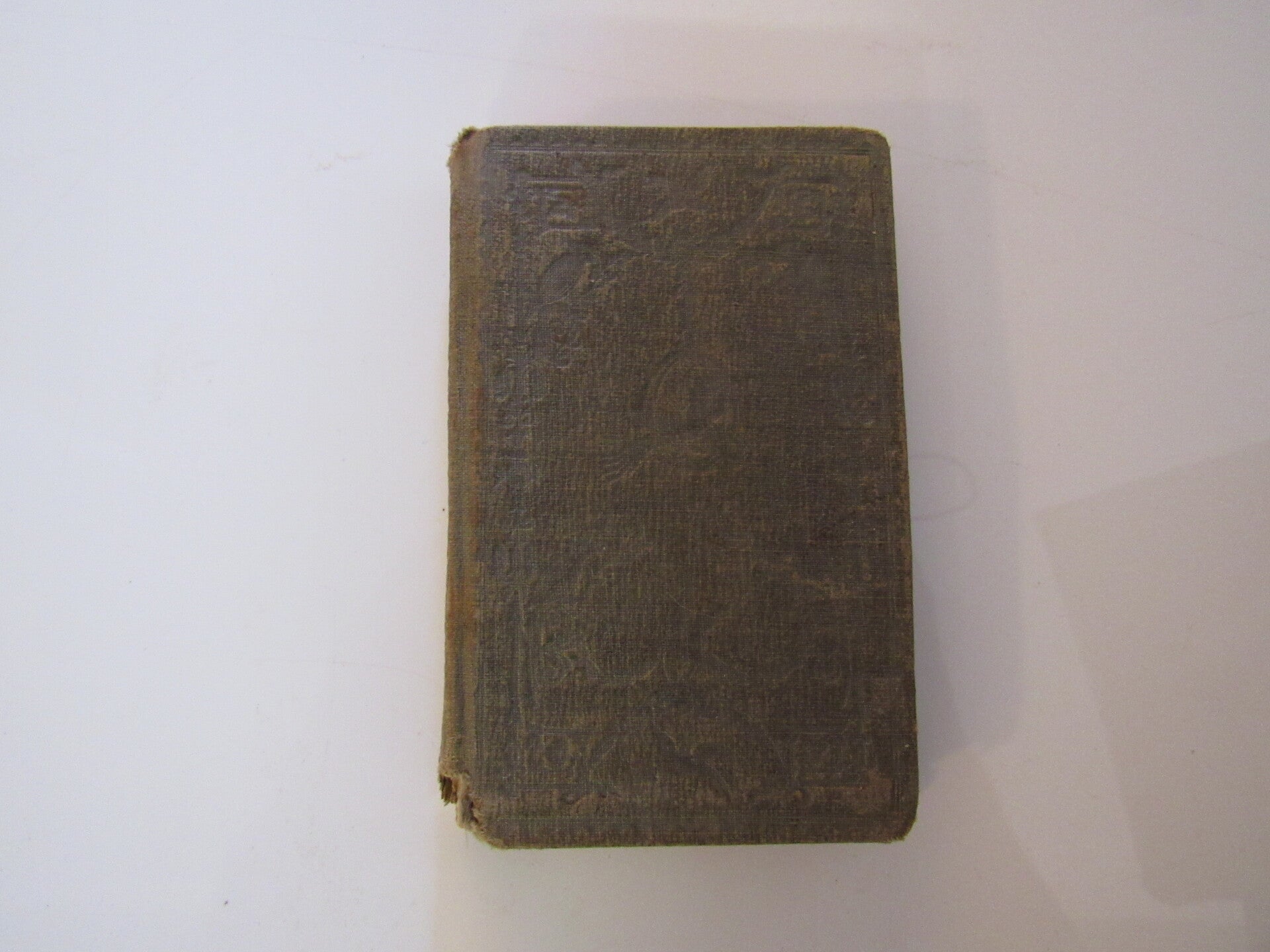 Miniature Book 4.25 x 2.5 inches. Interior solidly bound, but needs cover reconnected in front. Previous owner's signature in pencil. Light to mild foxing throughout. Gilt edges.
