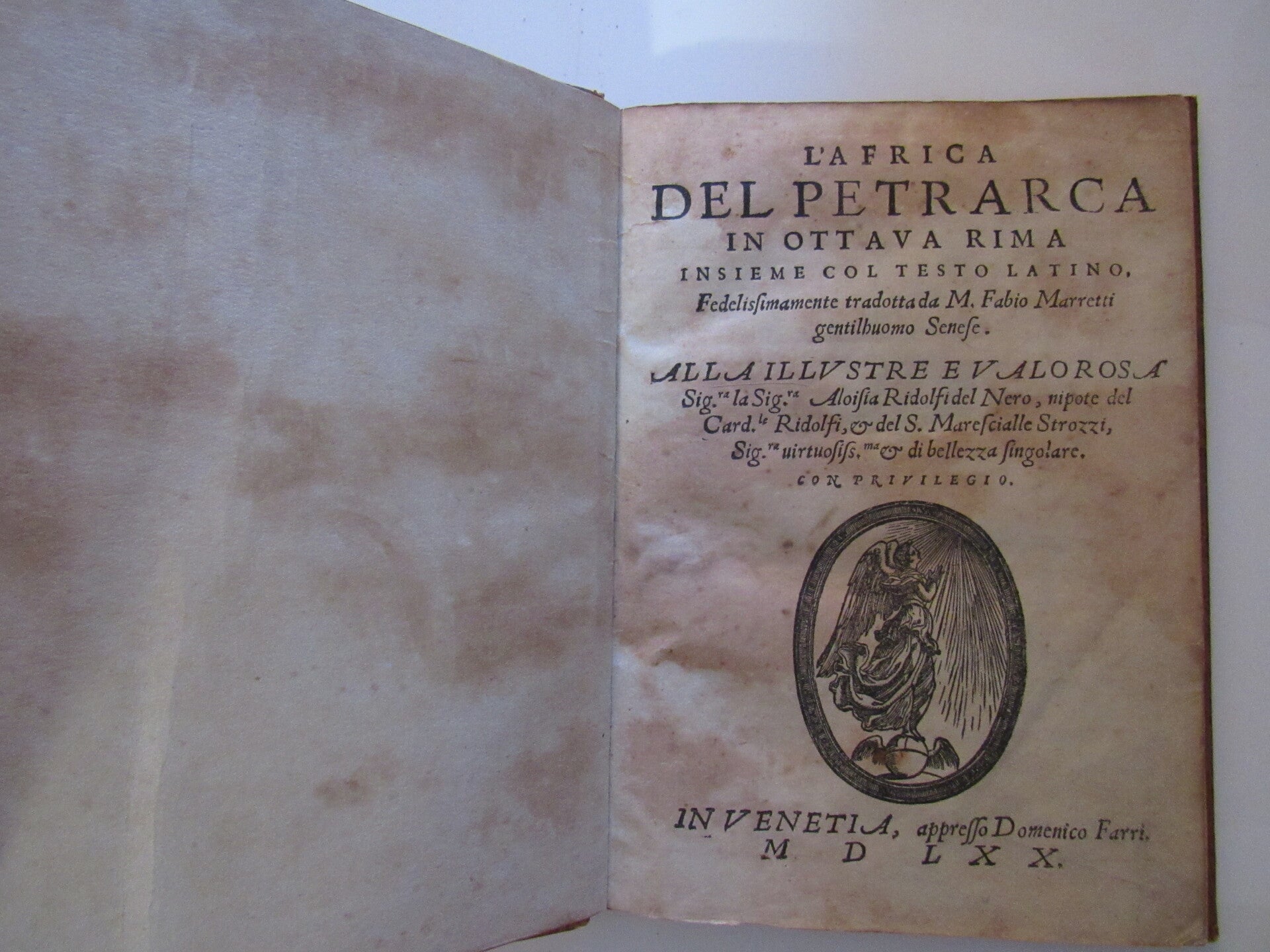 L’Africa del Petrarca in ottava rima insieme col testo latino, fedelissimamente tradotta da M. Fabio Marretti gentiluomo senese. In Venetia, appresso Domenico Farri, MDLXX (1570).