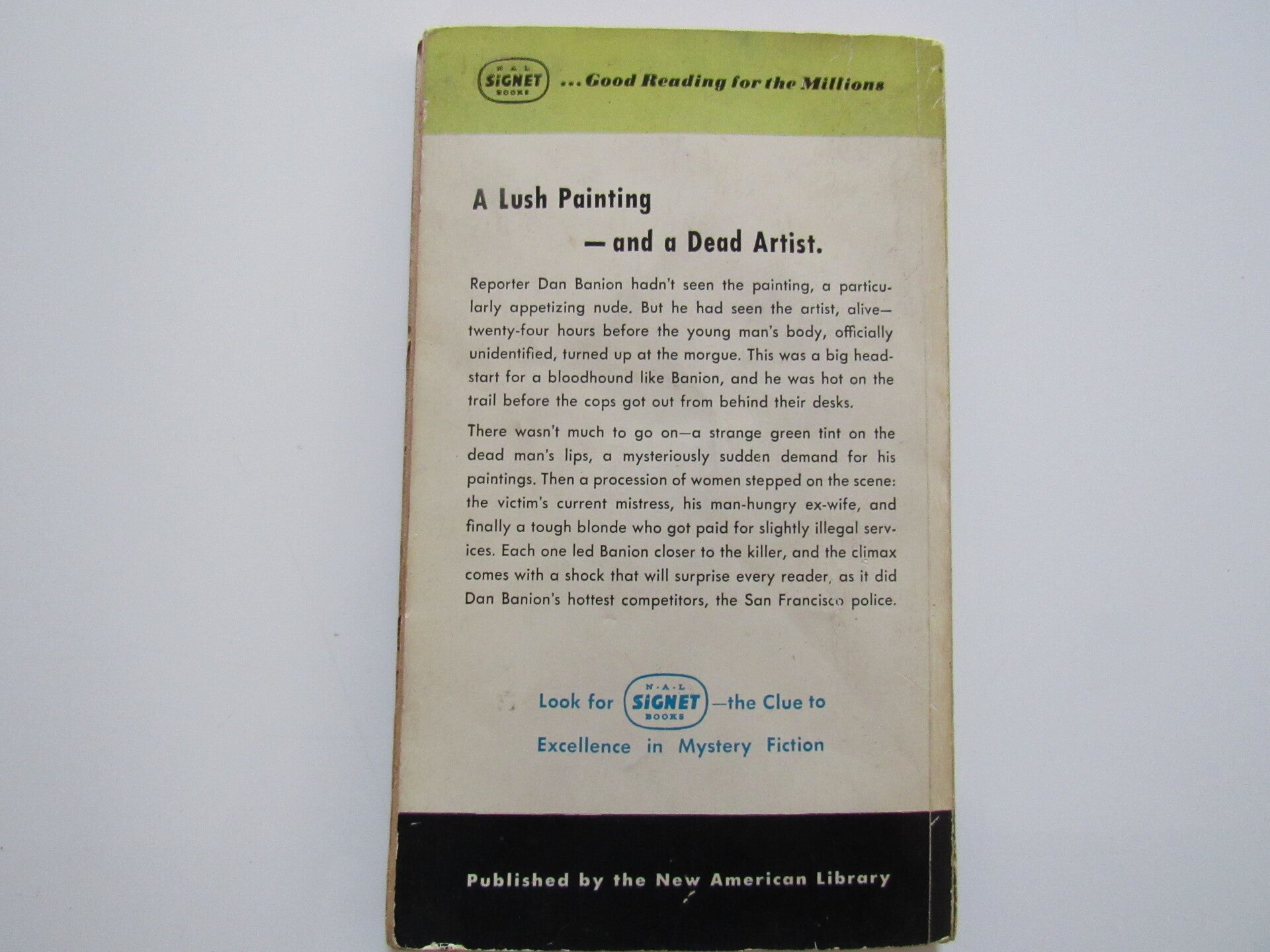 There wasn't much to go on - a strange green tint on the dead man's lips, a mysteriously sudden demand for his paintings. Then a procession of women stepped on the scene, the victim's current mistress, his man-hungry ex-wife, and finally a tough blonde who got paid for slightly illegal services. Each one led Banion closer to the killer, and the climax comes with a shock that will surprise every reader, as it did Dan Banion's hottest competitos, the San Francisco police.