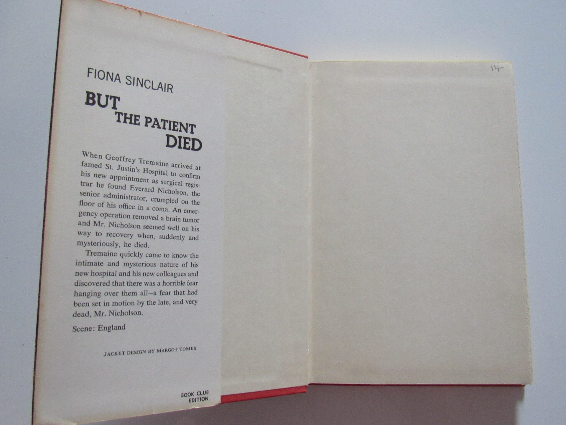 When Geoffrey Tremaine arrived at famed St. Justin's Hospital to ocnfirm his new appointment as surgical registrar he found Everard Nicholson, the senior administrator, crumpled on the floor of his office in a coma. An emergency operation removed a brain tumor and Mr. Nicholson seemed well on his way to recovery when suddenly and mysteriously, he died.