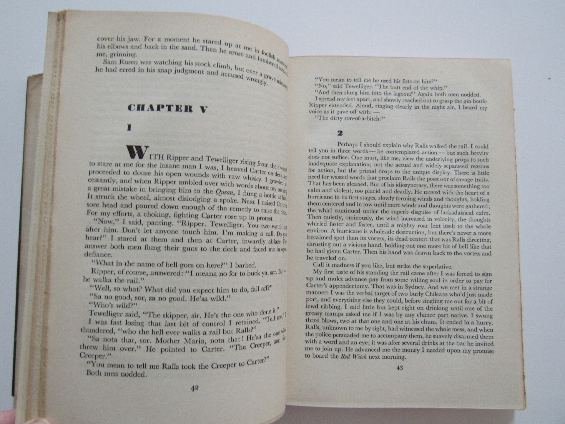 This is a ruthless story of a ship with three lives, sailed by men determined to win revenge, money, and power from the sea. It is a story of intense, tropical passion, expressed both in the desire of man for woman and in the conflict of men with each other. More, it is the story of the power which hate can attain when it drives coldly toward revenge, and of how, once achieved, that power sucks in all, even those who are themselves possessed of the devil. It is storytelling in the grand manner — no thin thread but many tough strands rolled into a richly colored whole.