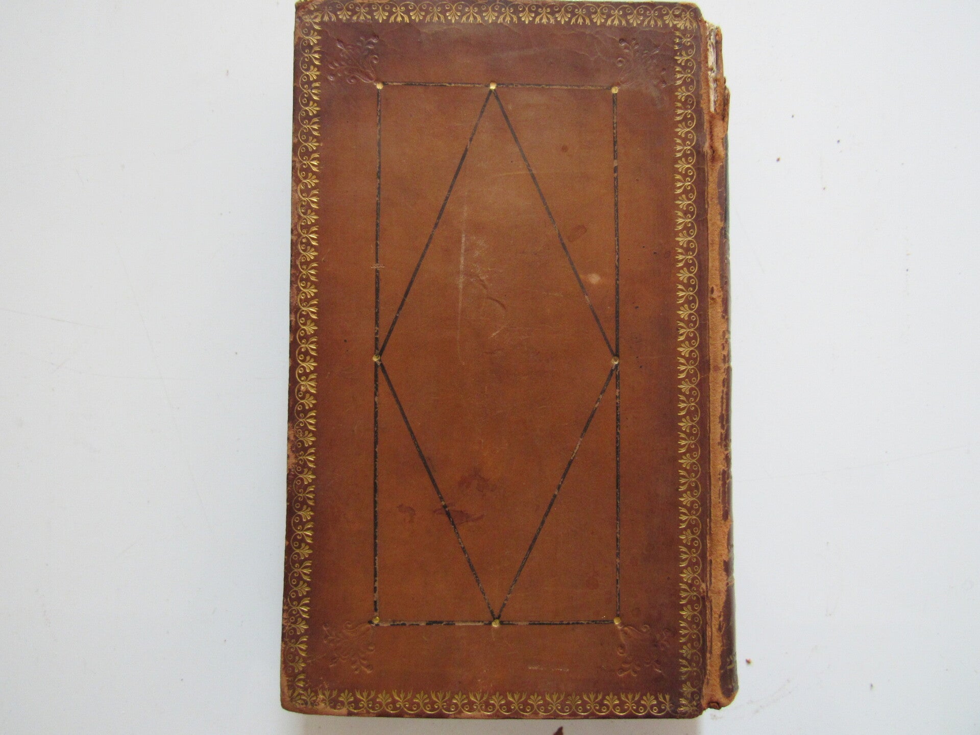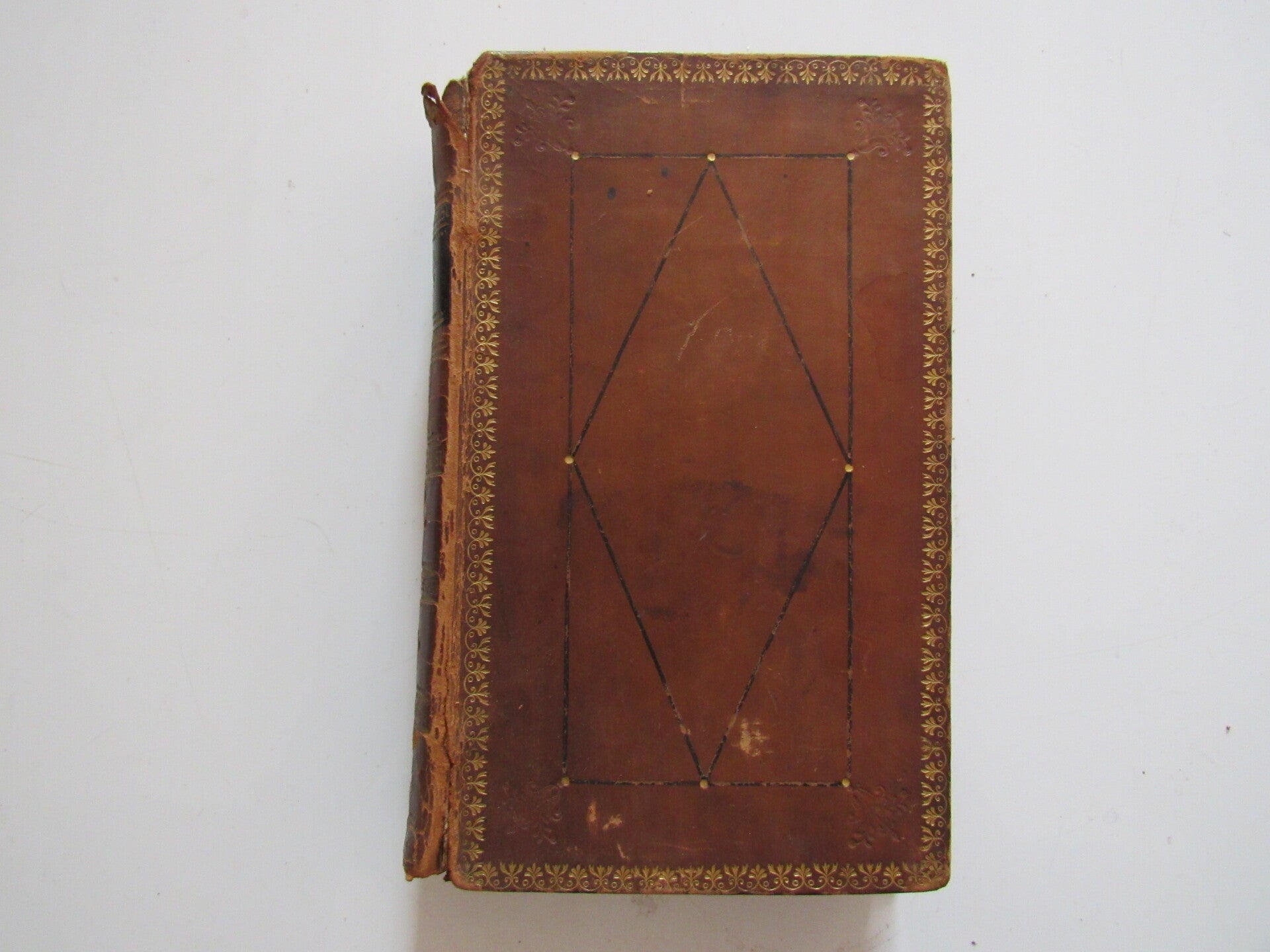 Leather bound with gild border. Spine slightly peeled back with thinning and cracks along hinges, but interior well bound.