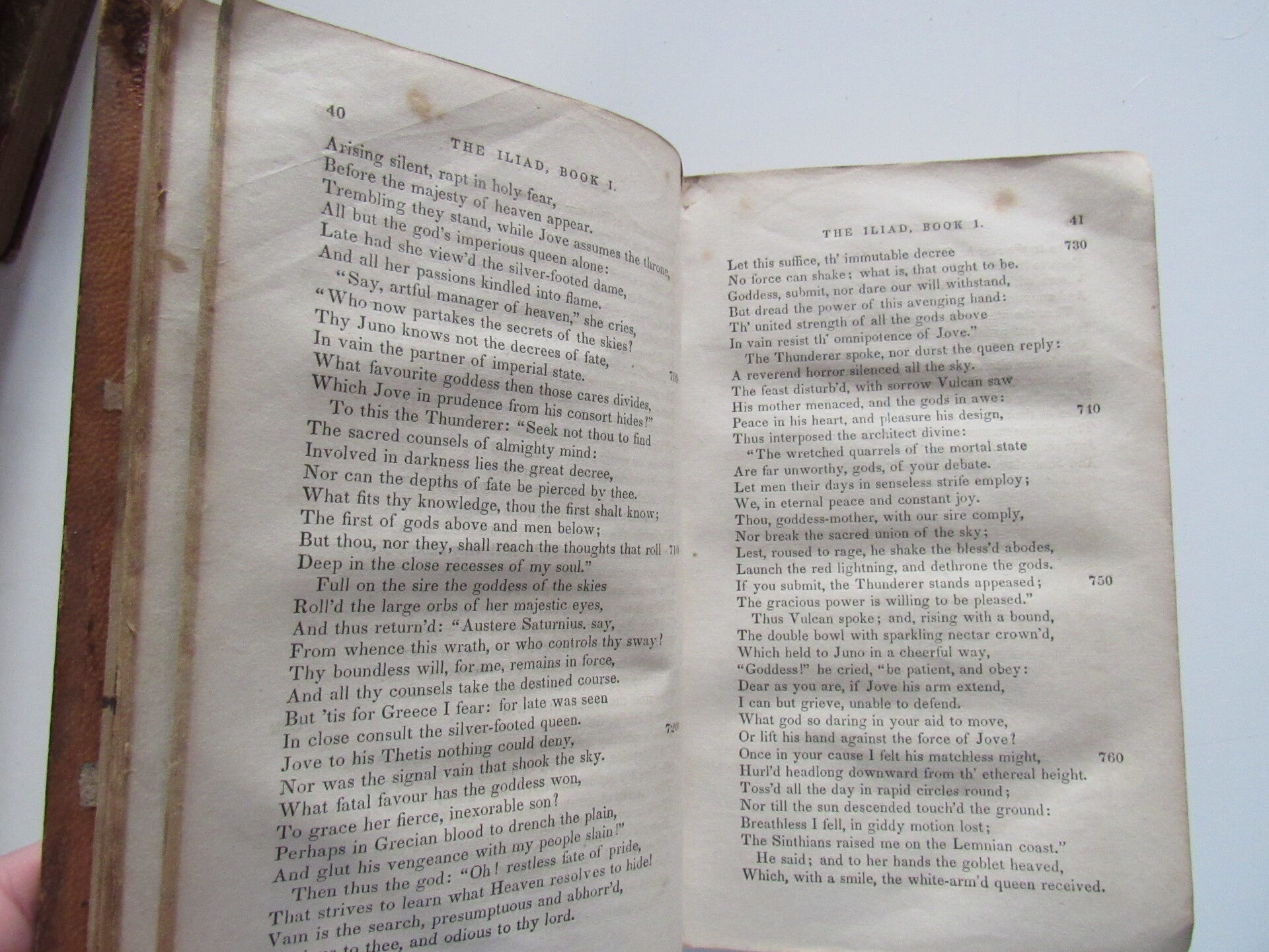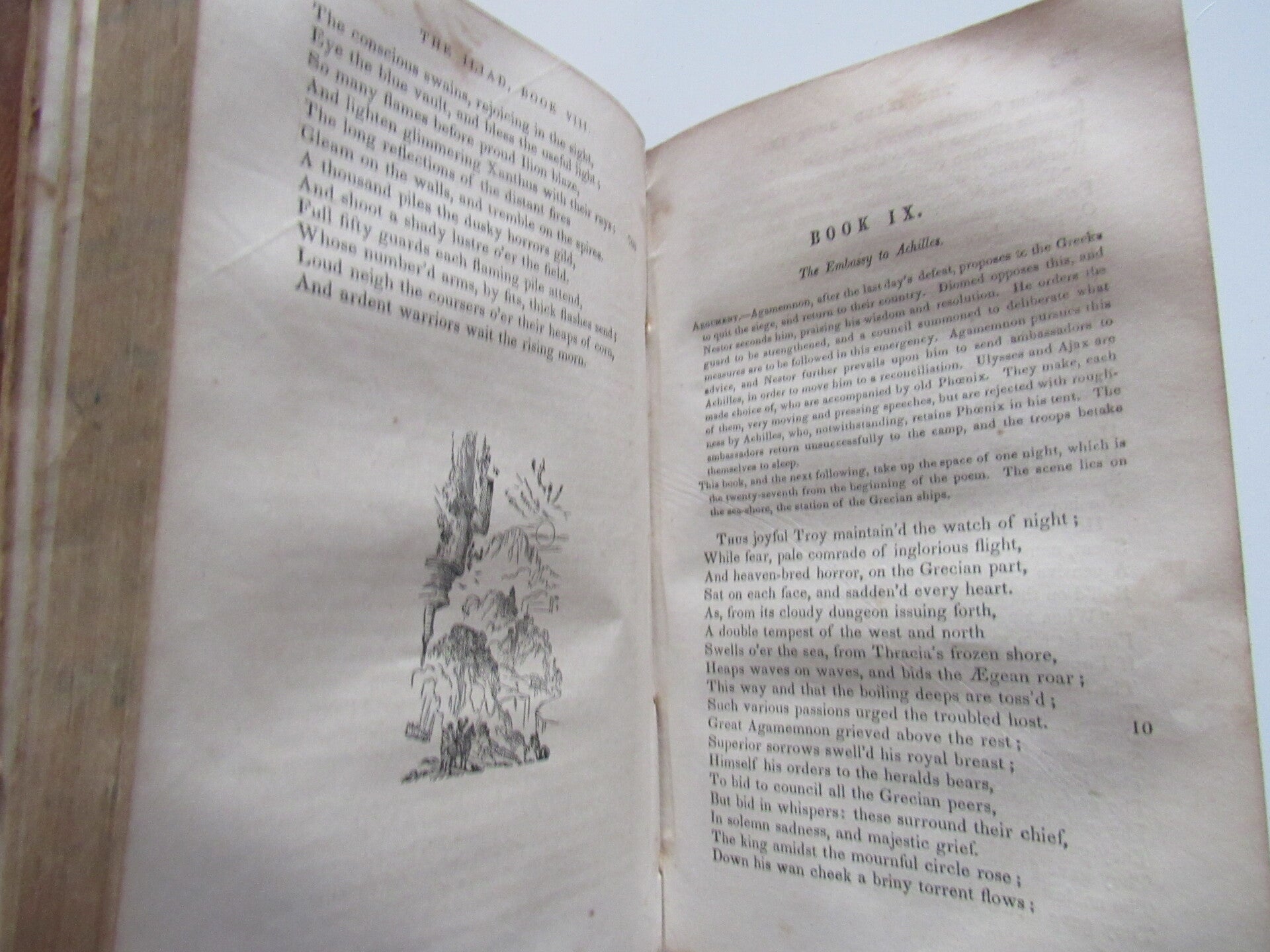 Leatherbound. Cracked and chipped along spine covers worn and thinned. Corners bumped, heavy edgewear. Interior has light rippling, but minimal foxing. Some end pages torn. Well bound despite flaws. A good reading copy, and if rebound, a beautiful edition of Pope's translation of Homer's classic Iliad.