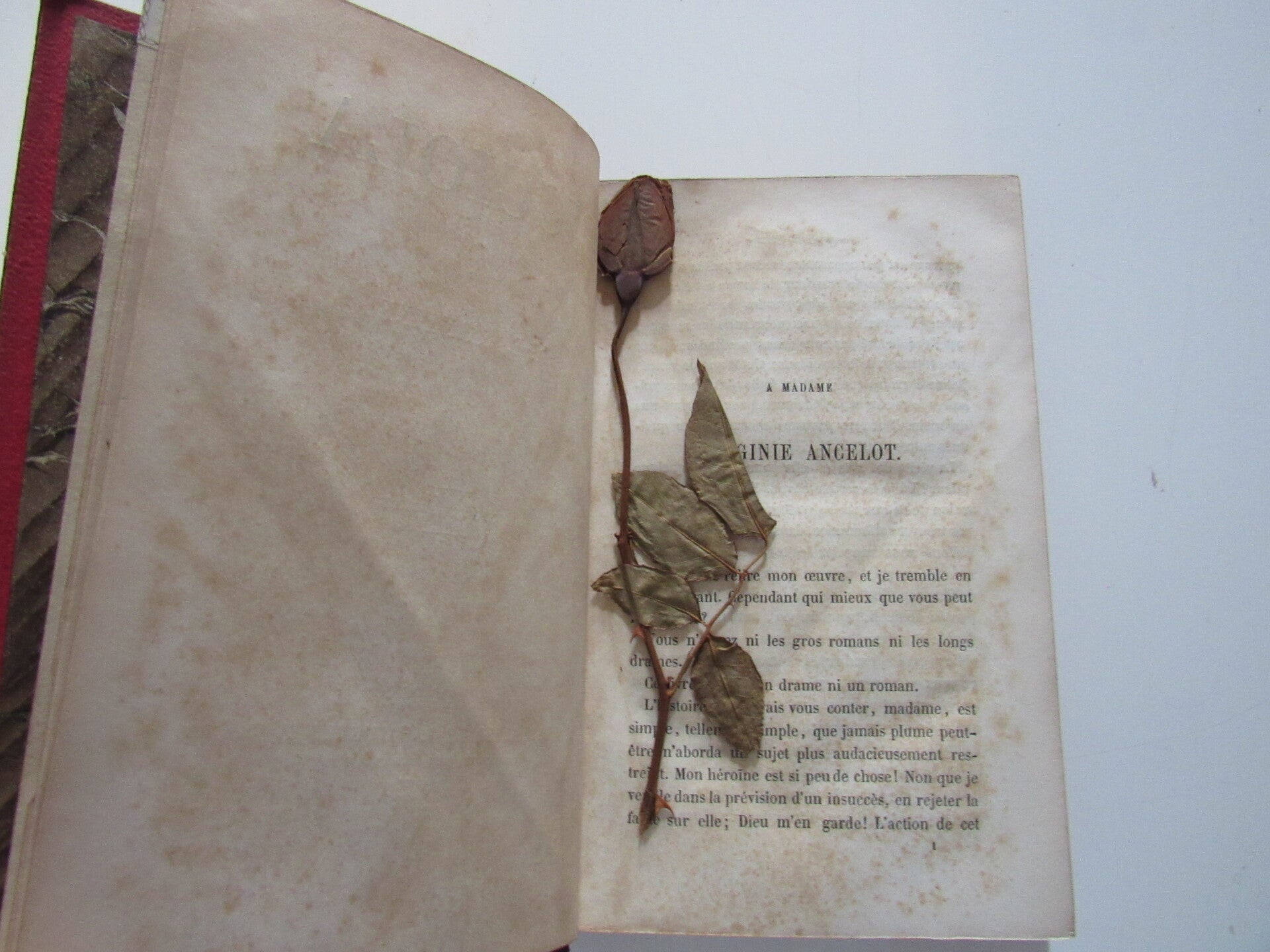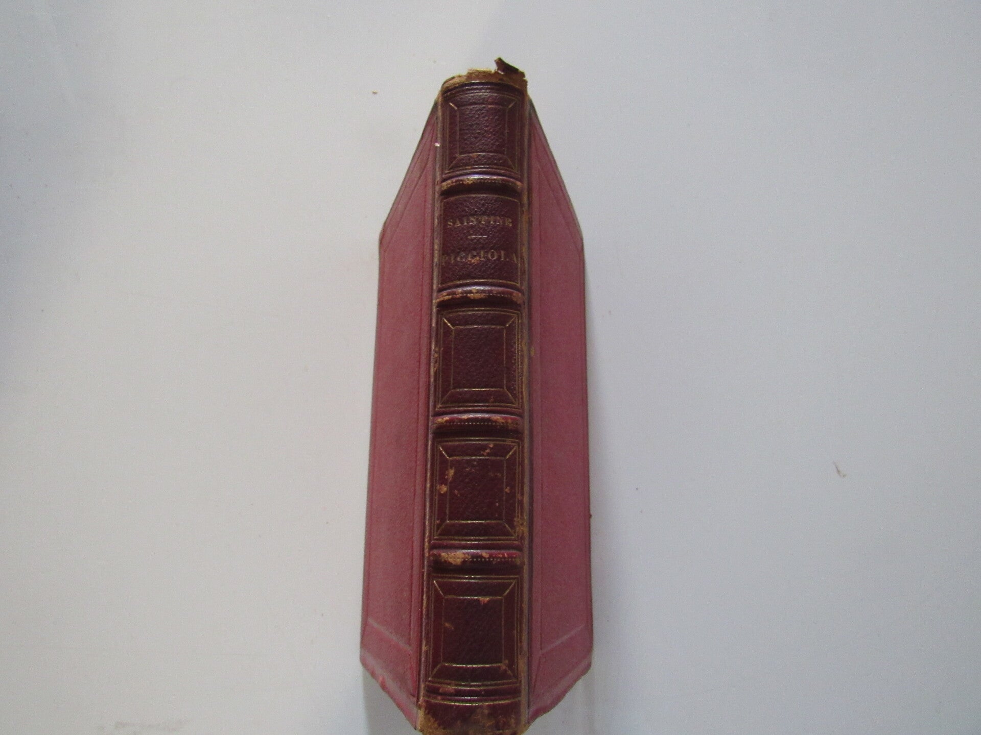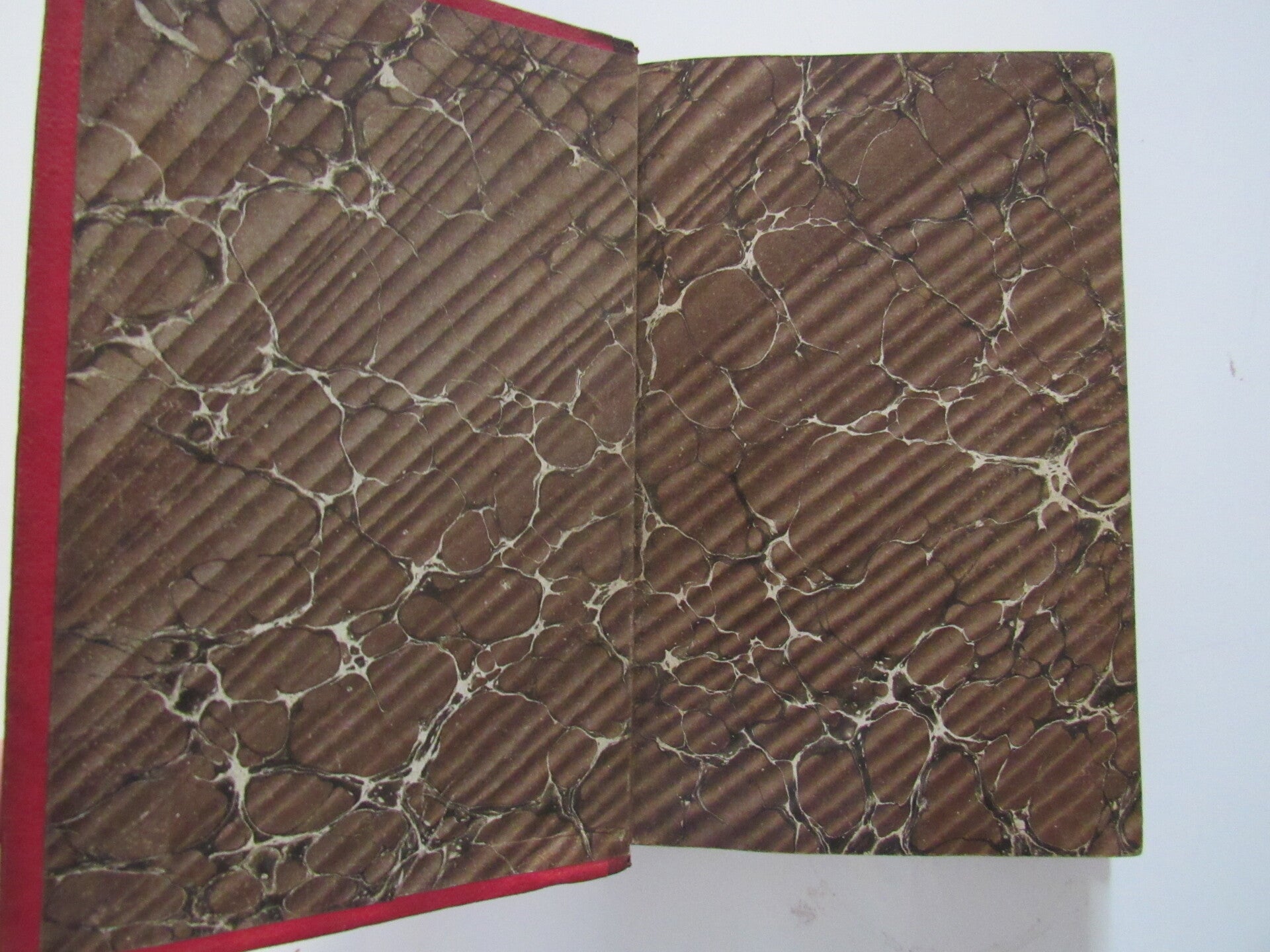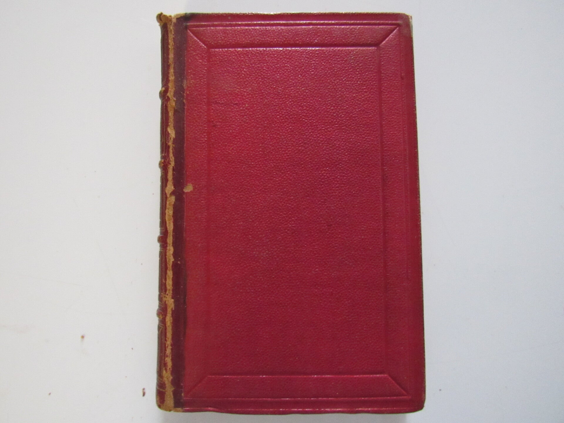 Leather bound, thinning along outer edge and top and bottom of spine, light edgewear. Gilt edges and marble end papers. Interior tightly bound and clean excepting first page in which a rose or flower has been pressed which has slightly discolored the paper. Previous owner signature on endpaper. In amazing condition for age.