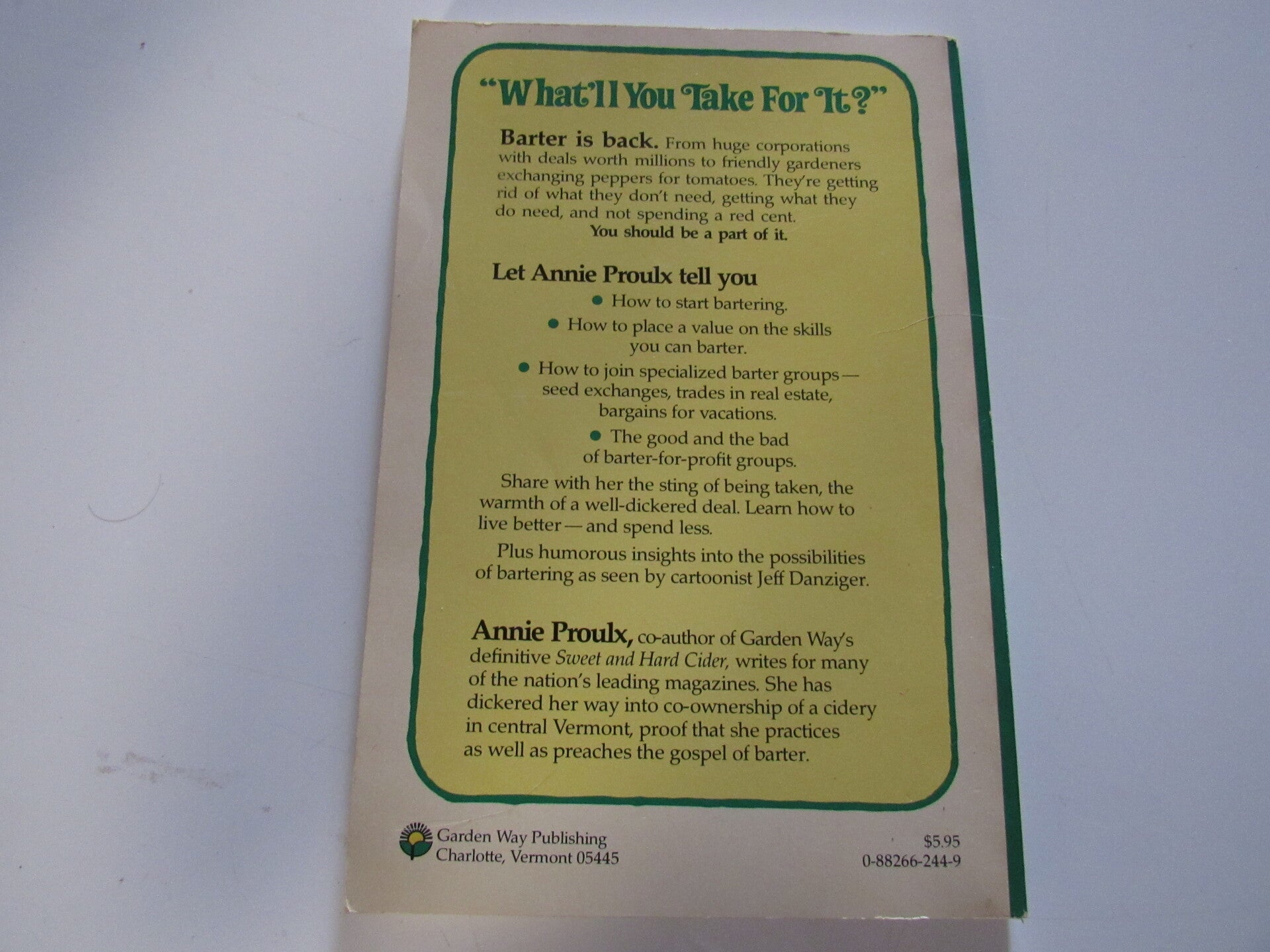 "What'll You Take for it? Back to Barter" is a 1981 book by Annie Proulx (not to be confused with her famous novels) that serves as a practical guide to bartering goods and services, discussing its advantages, group bartering, and the tax implications associated with it. The book, published by Garden Way Publishing, is a piece of the author's earlier work focused on homesteading and practical living