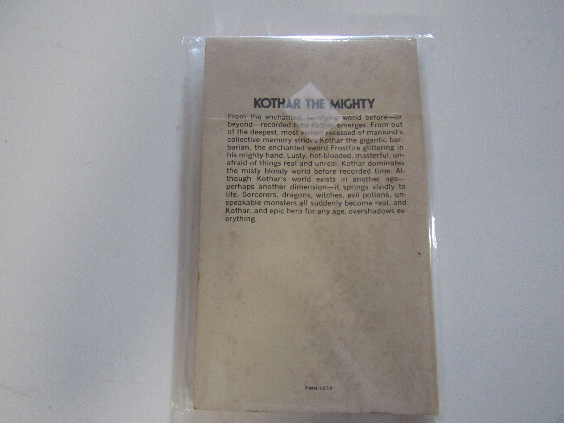 From out of the deepest, most violent recesses of mankind's collective memory, Kothar the gigantic barbarian strides, the enchanted sword Frostfire glittering in his mighty hand. Lusty, hot-blooded, masterful, unafraid of things real or unreal, Kothar dominates the misty, bloody world before recorded time. Yet, though Kothar's world existed in another age--perhaps another dimension--it springs vividly to life. Mapped, charted, chronicled, Kothar's fantastic world suddenly becomes real--the sorcerers, dragons, witches, evil potions, unspeakable monsters. And Kothar, an epic hero for any age, overshadows everything.