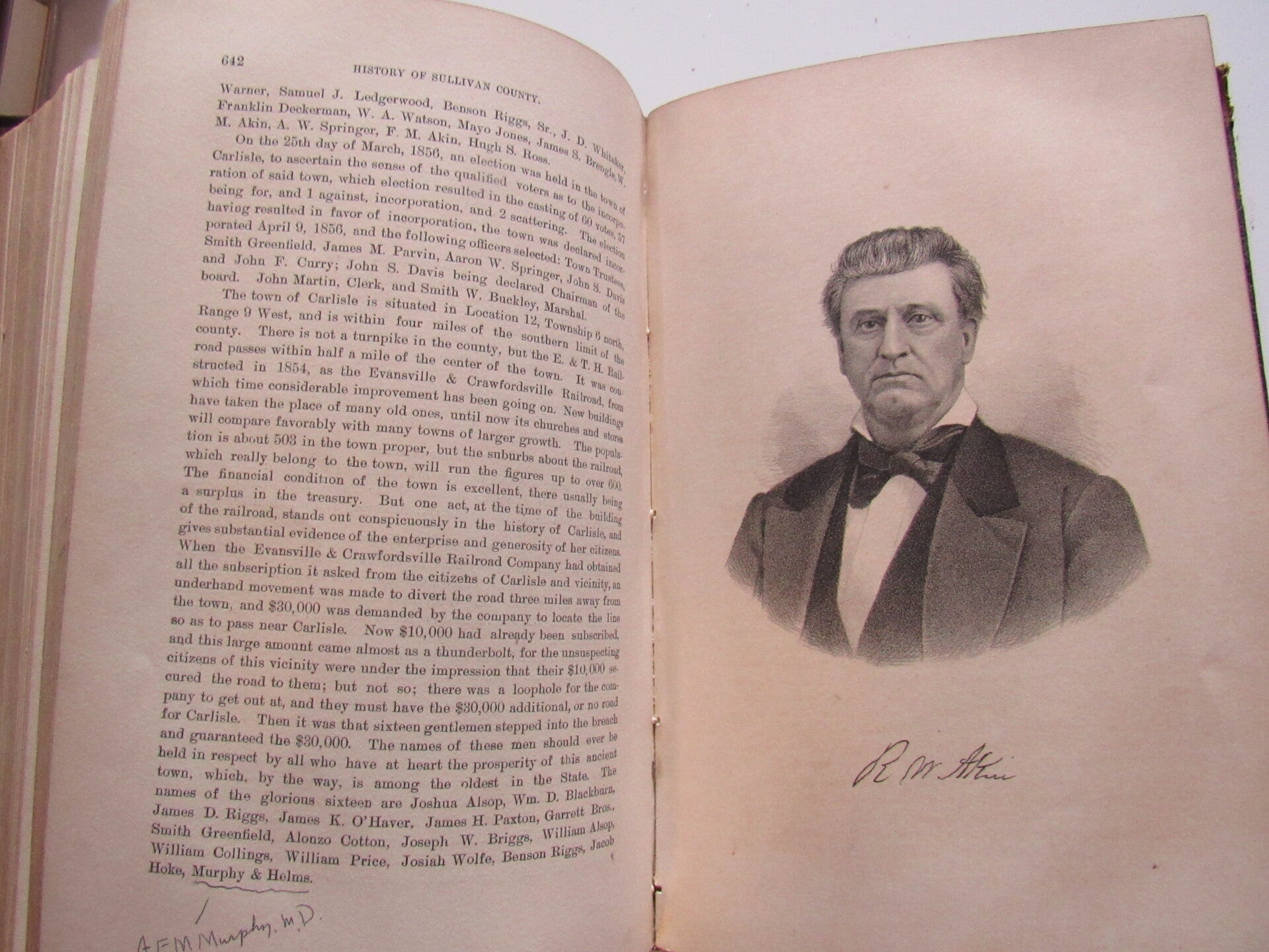 With notes penciled in front endpapers regarding the owners of the book, the Cavins(sp?) who have some history in these counties and in the history of Indiana, the previous owner having acted as deputy attorney general of the state around 1907 on according to penciled notes.