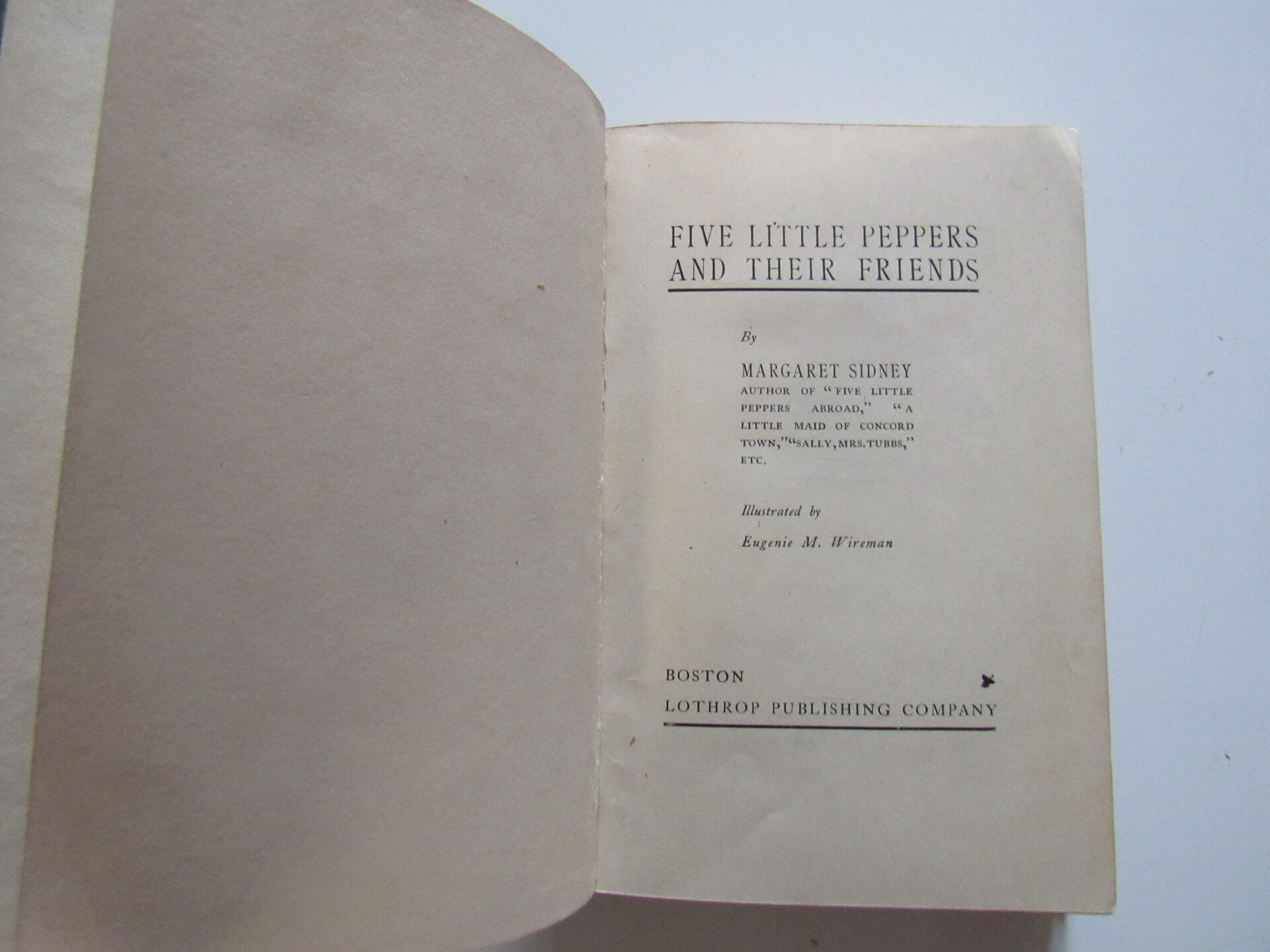 Margaret Sidney was the pseudonym of Harriett Mulford Stone (1844-1924). She was an American author, born in New Haven, Connecticut. In 1878, at the age of 34, she began sending short stories to Wide Awake, a children's magazine in Boston. Two of her stories, Polly Pepper's Chicken Pie and Phronsie Pepper's New Shoes, proved to be very popular with readers. The success of Harriett's short stories prompted her to write the nowfamous Five Little Peppers series. This series was first published in 1881, the year that Stone married Daniel Lothrop. Daniel had founded the D. Lothrop Company of Boston, who published Harriett's books under her pseudonym, Margaret Sidney.