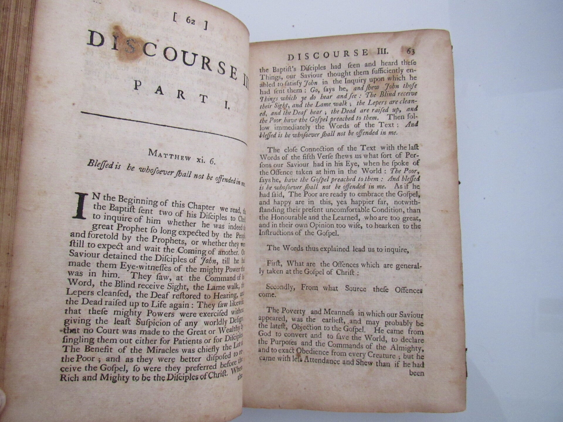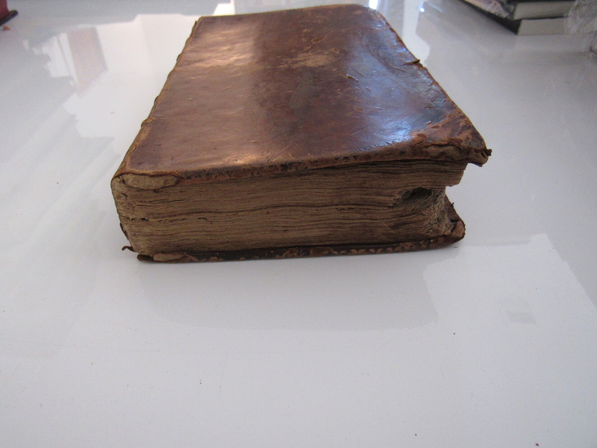 Bound in original leather with signs of wear, some cracking along spine. Edge wear and scuffing. Corners bumped, rubbed. Interesting inscription from previous owner in front pages. Foxing and tanning to pages. Pest mark (chewed?) at center, but text is not effected. At it's worst a solid readng copy. Scarce.