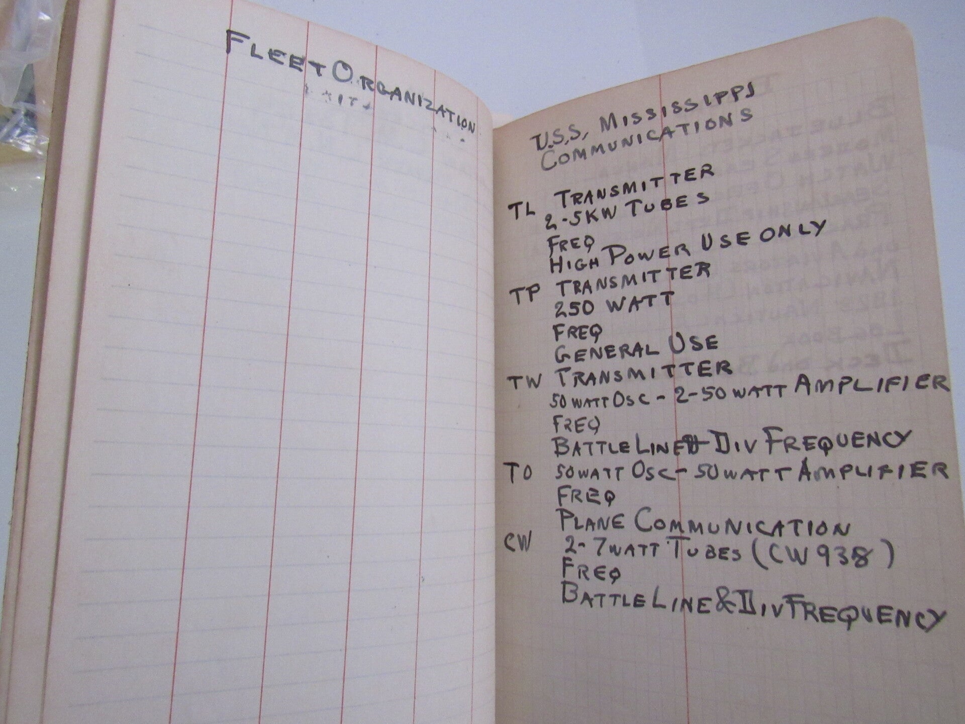 A fascinating look at life aboard the USS Mississippi with numerous entries, including some diagrams of the engine room, covering dates of April 17th to May 28th. The owner keeps track of shifts, duties, personal inventory of items. Transfered to USS Texas with some information regarding shifts on board the ship. Tables for reference printed in back.