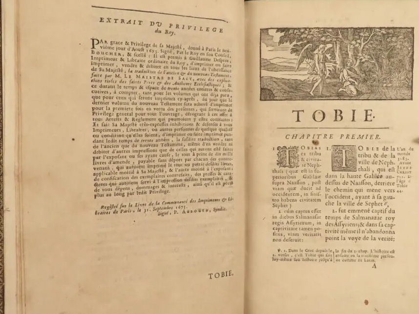 Tobias, Judith and Esther: Translated into French, with Explanation from the Holy Fathers, & Ecclesiastical Authors by Isaac-Louis Le Maistre de Sacy. His translation of the bible was one of the most popular translations in the 18th century, the first to be available to members of the public not familiar with latin.